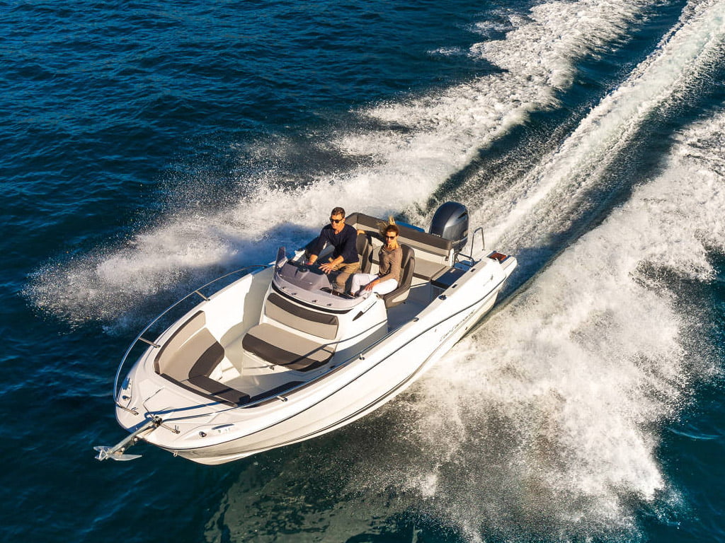 Alquila la Cap Camarat 650 en Sitges: 150 CV, amplio solárium con toldo, mesa opcional y ducha, ideal para disfrutar en aguas cristalinas con familia o amigos.